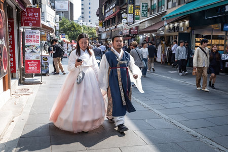Couple wearing traditional Korean costumes hanbok on the street of Seoul South Korea