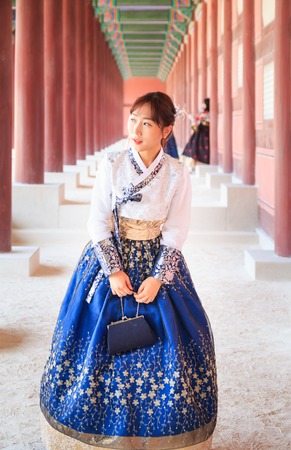 Beautiful girl at Gyeongbokgung in Hanbok, the traditional Korean dress