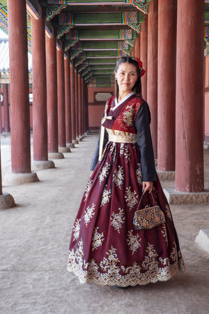 Seoul, South Korea - Apr 6, 2018 : Asian Korean woman dressed Hanbok in traditional dress walking in Gyeongbokgung Palace