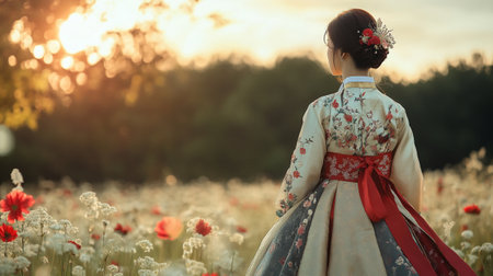 Beautiful woman in traditional kimono walking in poppy field at sunset