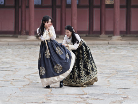 seoul south korea - 10th november 2017: young korean girls in traditional hanbok dresses at gyeongbokkung palace.
