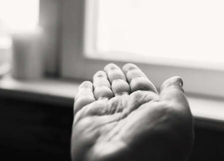 Open human hand is turned toward window at day in black and white