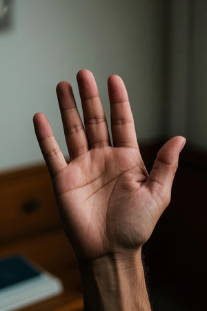 A detailed close-up shot of a persons open hand, palm facing forward, with fingers slightly spread. The hand is illuminated by soft, natural light coming from a window on the left, creating subtle shadows and highlights. The background is blurred, suggesting an indoor environment.