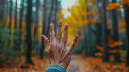 A persons hand reaching out to the camera in a forest, AI