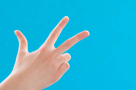 2 fingers. Two thumbs up. Woman shows two fingers. Peace sign. Fingers on a blue background