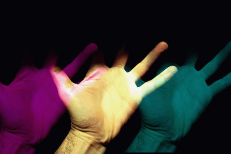 Hands of two men in colored neon light on a black background