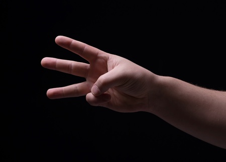 Dramatic colour image of male hand demonstrating sign language number three against black background with empty copy space for editors