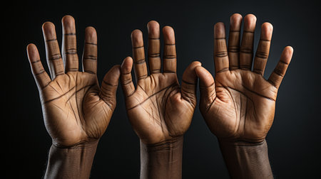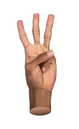 Dramatic colour image of male hand demonstrating ASL American sign language letter W with empty copy space for editors