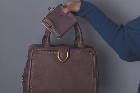 Beautiful hand with red manicured nails holding gold purse handbag on gray background.