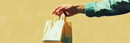Mans hand in a black medical glove holding craft bag on the yellow background : Generative AI