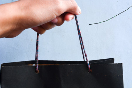 Photo of a hand carrying a gift bag, a small black paper bag. close up