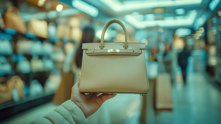 Woman hand holding brown leather handbag in shopping mall - vintage filter