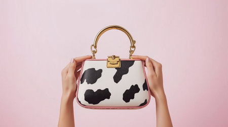 Woman holding Trendy cow print handbag with gold handle against pastel pink background