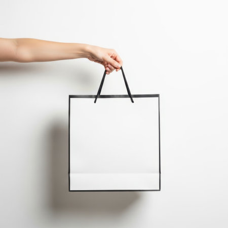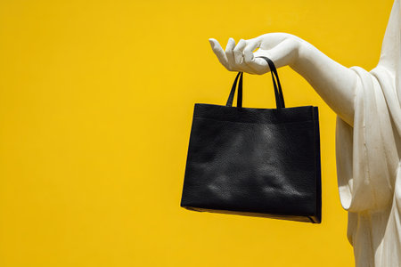 A person holds a sleek black shopping bag in a lively sky setting, capturing the essence of modern consumerism and outdoor lifestyle. Light and color blend harmoniously.