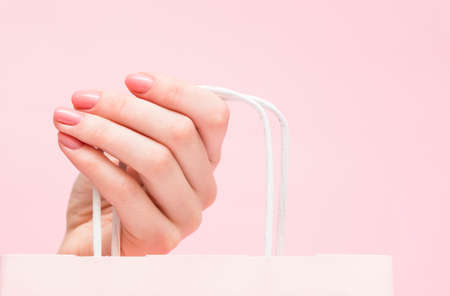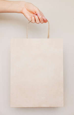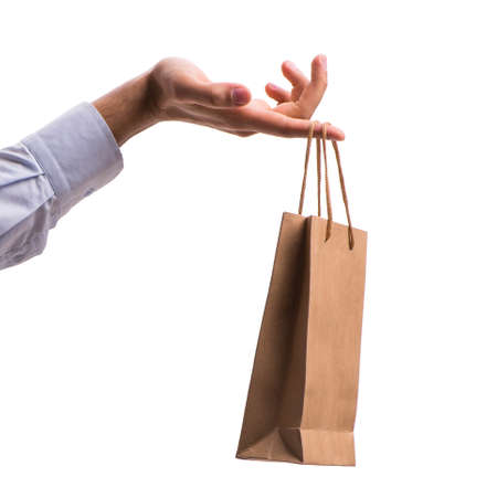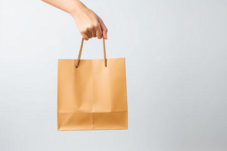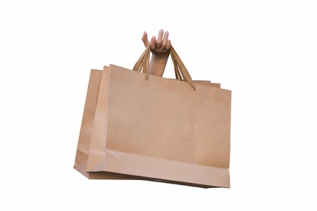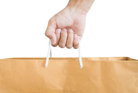 Close-up hand is holding blank paper shopping bag on a white background with copy space composition.
