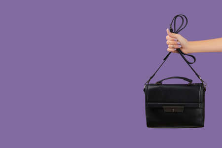 Close up of woman hand holding black shopping bag on the black background. Banner on the black background