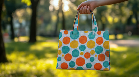 A colorful polka dot bag is held in hand, surrounded by lush green park. vibrant design adds cheerful touch to serene outdoor setting..