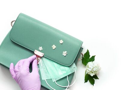 blue leather women bag with a medical mask, a sanitizer and gloves. Concept spring-summer 2020 exit from the coronavirus pandemic. protective equipment after isolation.