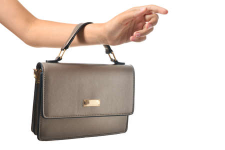 Woman hand holding black shopping paper bag with one hand isolated on white background.