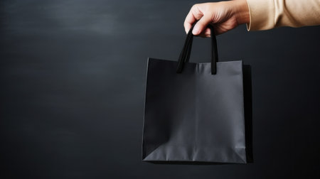 A close up shot shows a hand holding a black textured paper shopping bag with rope handles against a dark plain background