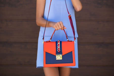 Stylish blue with orange leather women bag. The girl holds in her hand. Bag close up.