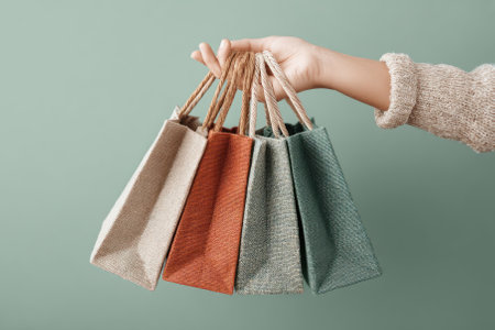 Hand Holding Colorful Eco-Friendly Shopping Bags on Green Background