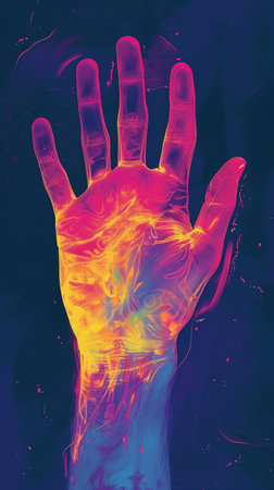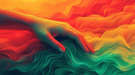 Vibrant abstract image of a hand reaching towards colorful background, artistic expression concept