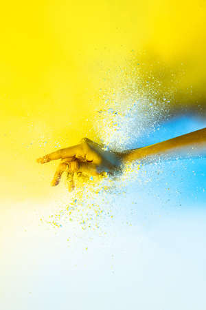 Yellow and white. Female hand and explosion of colored, neoned powder on bright studio background with copy space. Magazine cover, wallpaper design