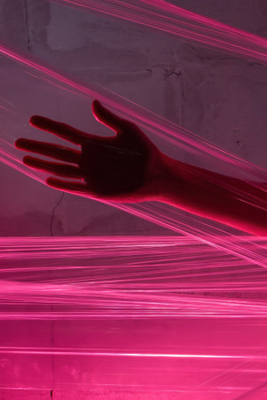 Night horror. Paranormal mystery. Red color light defocused trapped creepy woman silhouette touching scratched plastic polyethylene film transparent wall.