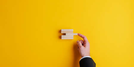 Hand of a businessman pushing wooden peg into a stack of them in a conceptual image. Over bright yellow background.