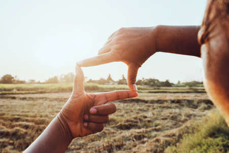 Two hands form with a fingers a frame in front of a blue sky with clouds and reflection