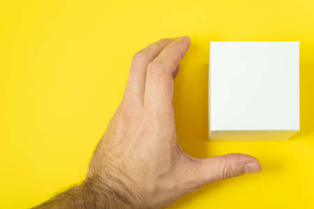 Mens hand takes white cardboard box. Man wants to take box. Copy space. Mock up