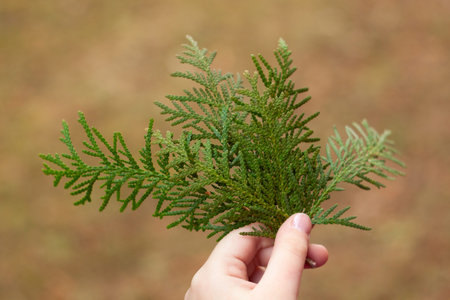 Side view closeup of unrecognizable African American woman gently stroking green arborvitae plants outdoors, copy space