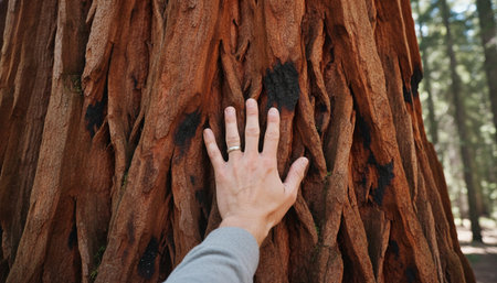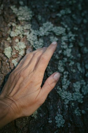 hand gently rests on the rough surface of tree bark covered in lichen. Sunlight filters through the trees, creating a serene moment of connection with nature.