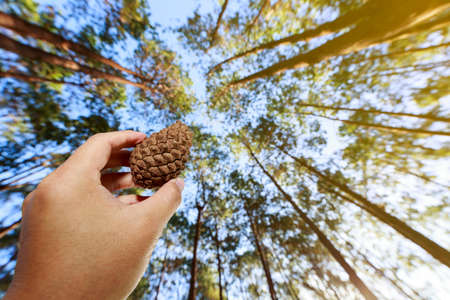 Hand holding a single dried pine cone in pine forest with natural sunlight