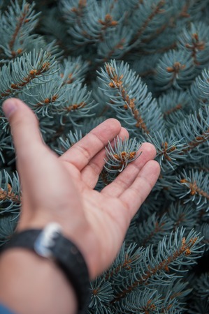 Caucasian male hand touching a tree trunk in a forest. Close up shot, shallow depth of field, rough tree bark texture