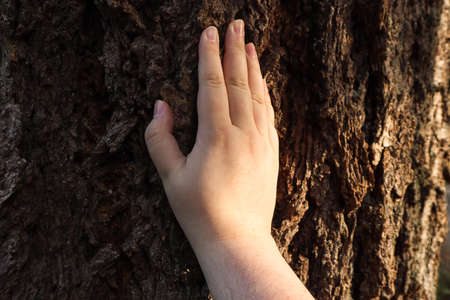 Save environment,Woman hand touch the tree . Hand on tree trunk, brown tree bark, hand hold tree touch to feel texture of nature