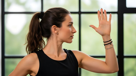 Woman stretching their arms to relax and be flexible while doing exercise in their home.