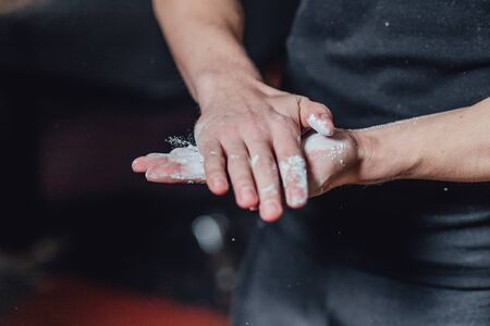 Gym Chalk Magnesium Carbonate hands clapping man for climbing workout.