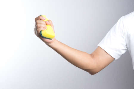 Woman’s hand holding an pink rubber grip or Hand squeezes expander exercise, Sport and fitness concept.