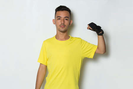 young sporty man dressed in yellow tshirt showing strong gesture on white background