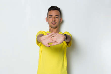 young sporty man dressed in yellow tshirt doing stretching on white background