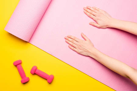 top view of female hands on pink fitness mat near dumbbells on yellow background