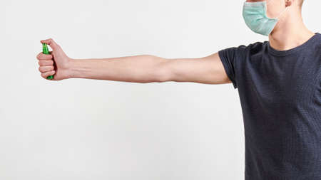Man in dark shirt and protective medical mask is spraying hand sanitizer. Light background, closeup.