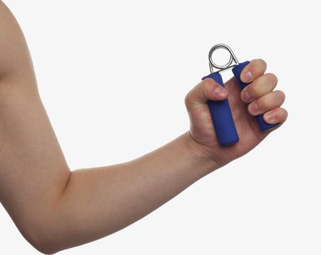 hand with a wrist protective strap doing exercises by squeezing an A shape hand trainer