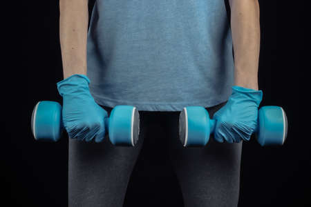 Fitness during quarantine from the covid-19 pandemic. Athletic woman in gloves holds a dumbbell in her hands on a black background.
