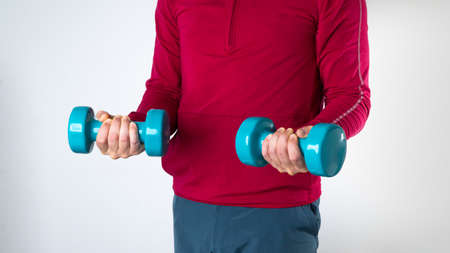 Hands of a male athlete holding some light blue dumbbells while doing a fitness workout. Concept of equipment, sportswear and initiation to sport and fitness.