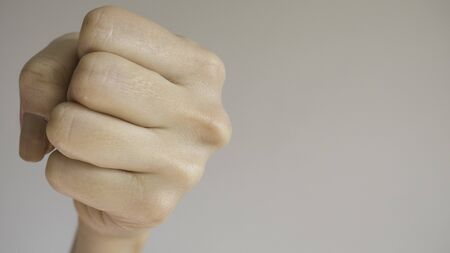 a close up shot of a clenched human fist against a plain light gray background showing skin texture details