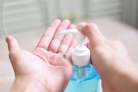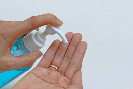 Female fingers pumping alcohol-based hand sanitizer gel on hand for killing germs, bacteria and virus. Disinfection concept of cleaning and washing hands with alcohol sanitizer.