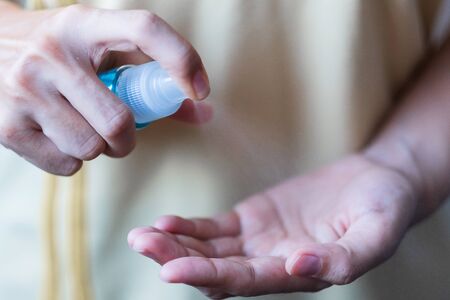 Female hand holding sanitizer bottle and pouring disinfecting alcohol gel to palm of other hand to prevent from covid-19.